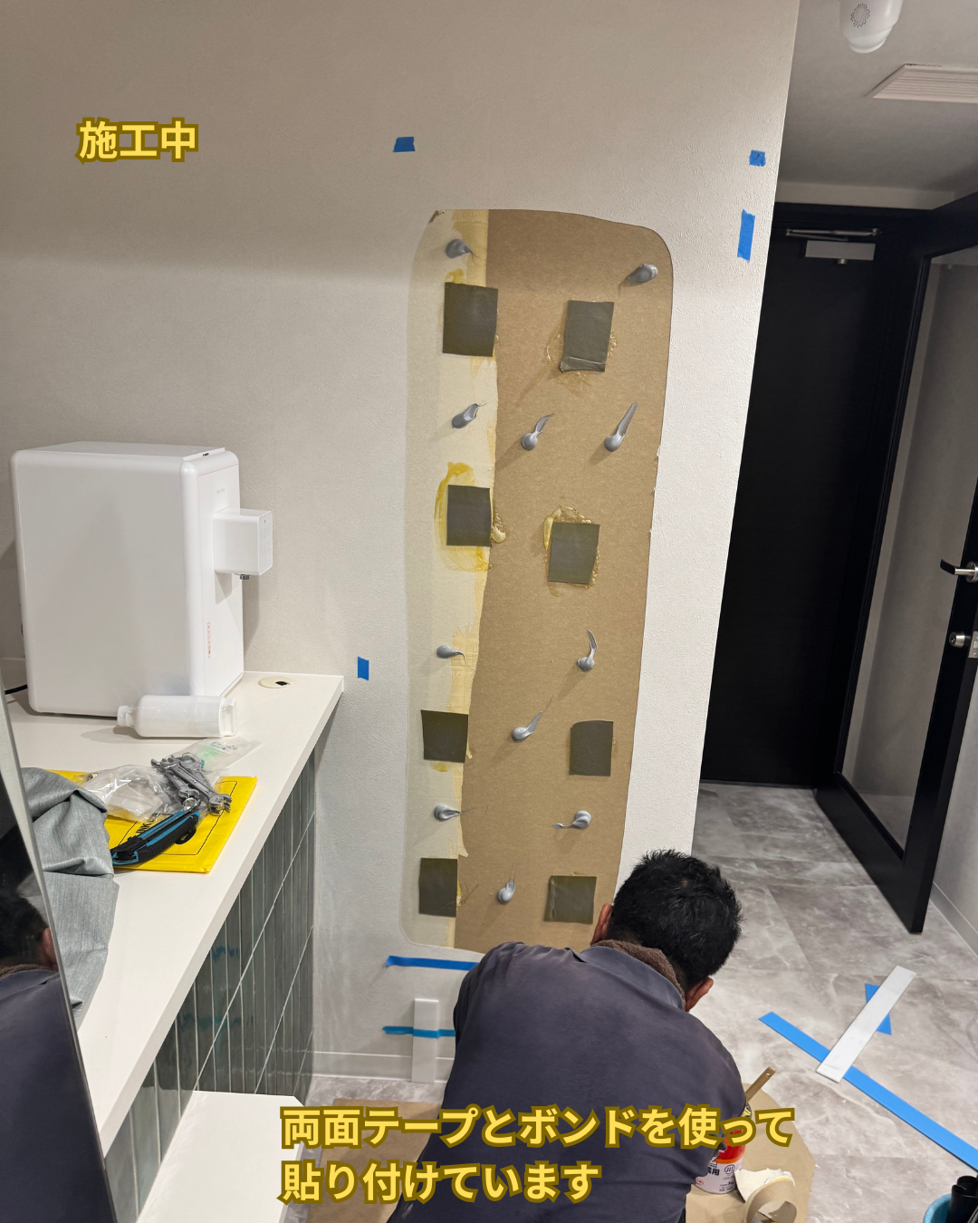貼付け場所を確認し、ミラーはテープとボンドで接着します。