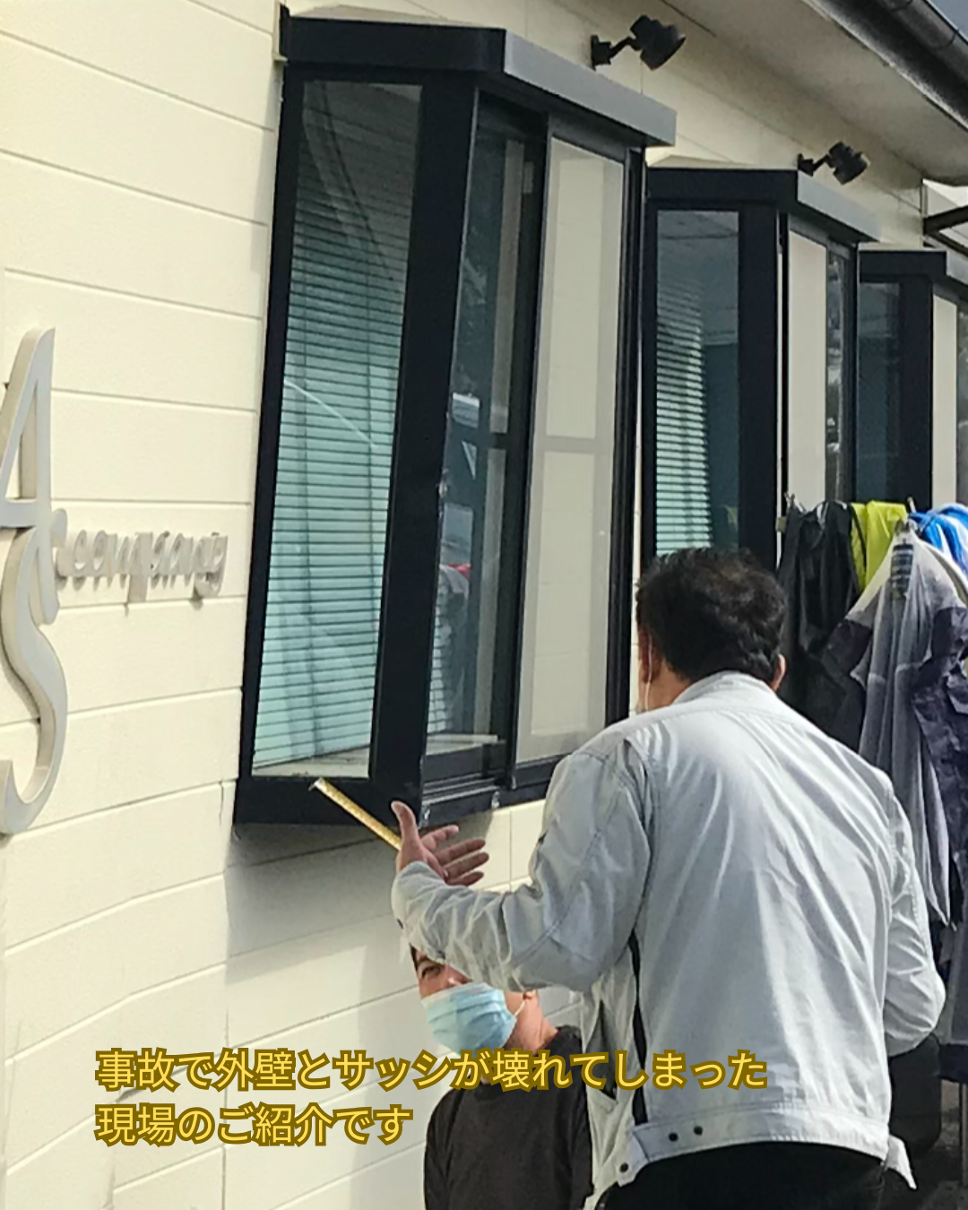 事故で破損してしまった外壁とサッシの修繕工事です。